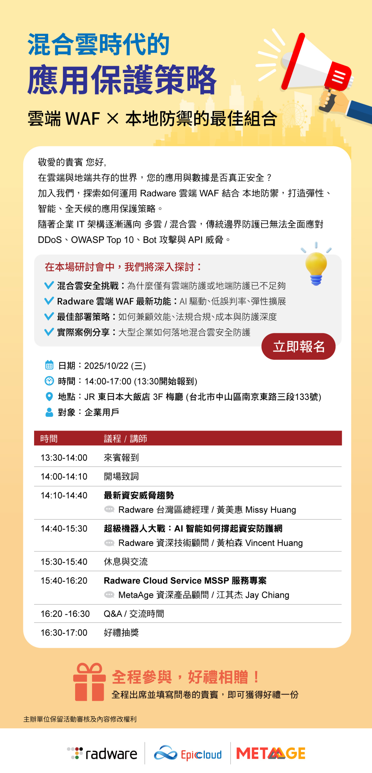 立即報名,探索如何運用 Radware 雲端 WAF 結合本地防禦,打造彈性、智能、全天候的應用保護策略!