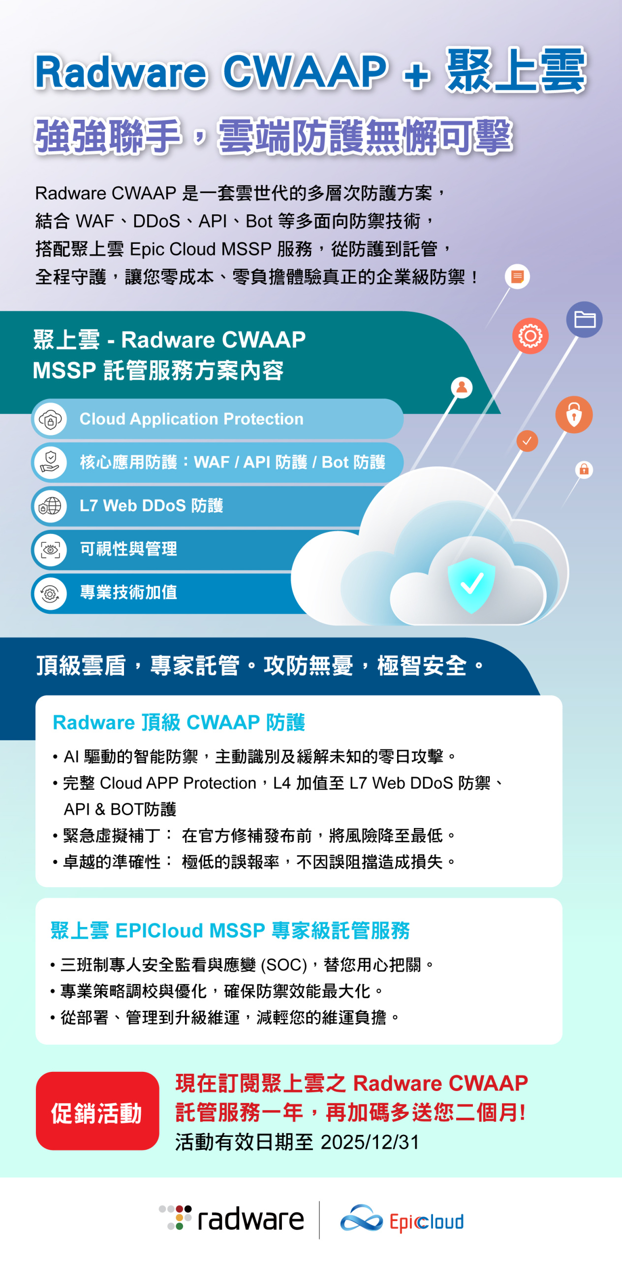 現在訂閱聚上雲 Radware CWAAP MSSP 託管服務一年,再加碼多送二個月!活動只到 2025/12/31,立即洽詢!