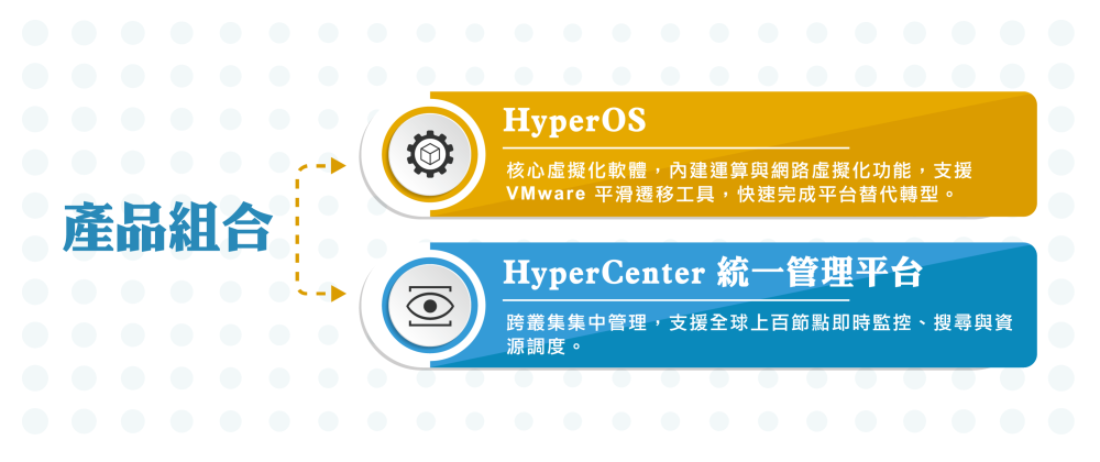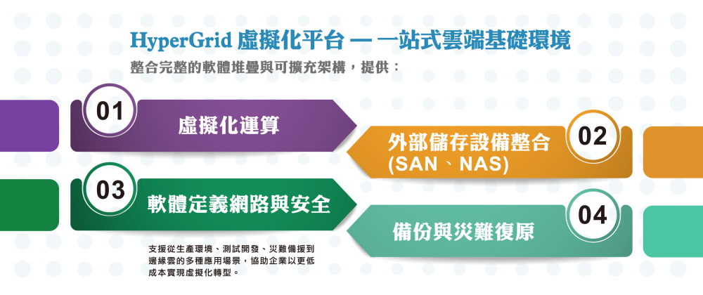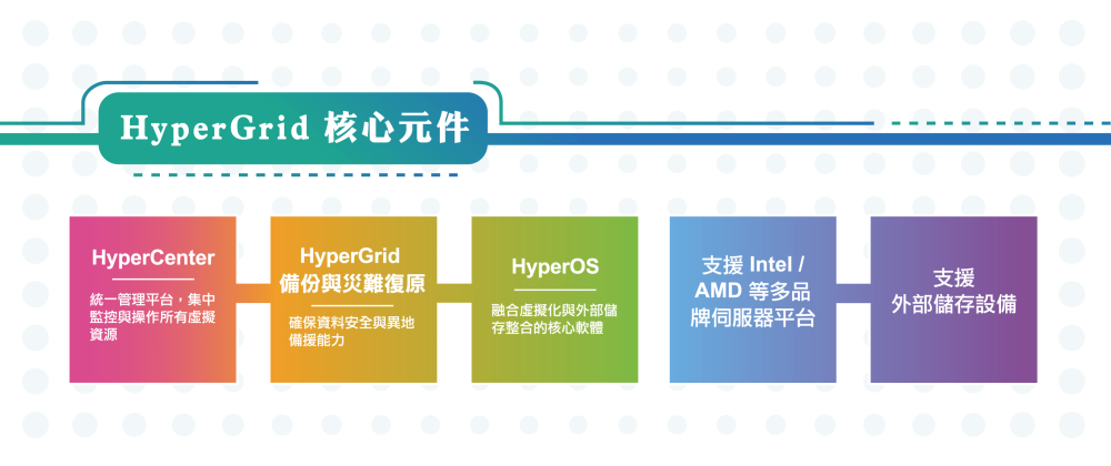 HyperGrid虛擬化平台,是企業實現次世代高效能IT架構的關鍵驅動力,我們採用軟體定義為核心創新架構,將企業的運算、儲存與網路環境抽象化並集中管理,透過HyperGrid,企業能以更精簡的硬體與更簡單的操作,快速建構出高效、彈性、且具備無限擴充能力的基礎環境。不僅能靈活調度資源,大幅降低總體成本(TCO)與維運的複雜度,更能以最低成本,重新啟動企業級的虛擬化轉型。